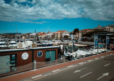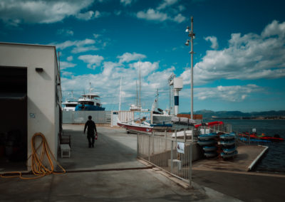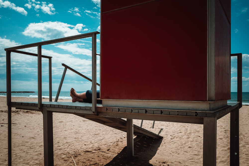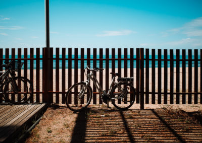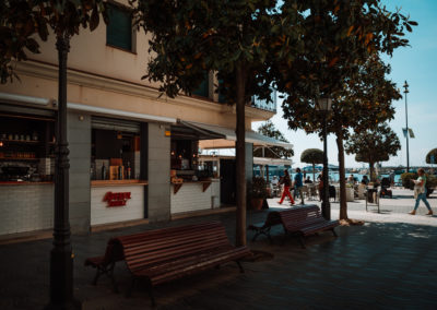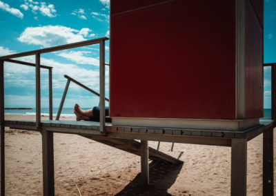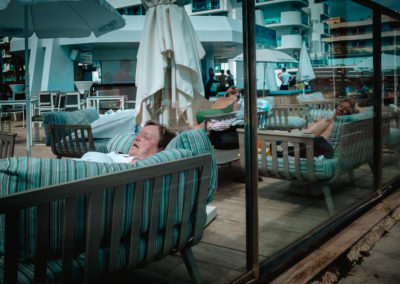 Loin de la Côte d’Opale et de ses ciels changeants, Cambrils offre un tout autre visage de la Méditerranée. Cette petite ville catalane de la Costa Dorada, à quelques kilomètres de Tarragone, dévoile une lumière crue et franche qui sculpte les corps et les façades avec une netteté presque brutale. Entre la promenade maritime et les ruelles du centre ancien, cette série capture les moments ordinaires d’une ville balnéaire espagnole : déambulations de touristes, siestes sur les bancs, silhouettes découpées contre le bleu intense de la mer. Le contraste est saisissant avec les territoires du Nord : ici, tout semble plus vif, plus contrasté, baigné dans cette clarté aveuglante qui efface les nuances. Les terrasses des restaurants du port, les parasols alignés sur la plage, les palmiers qui ponctuent le front de mer composent un décor familier du tourisme méditerranéen.