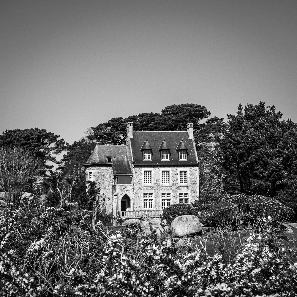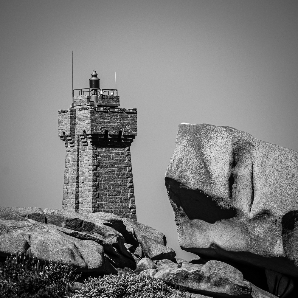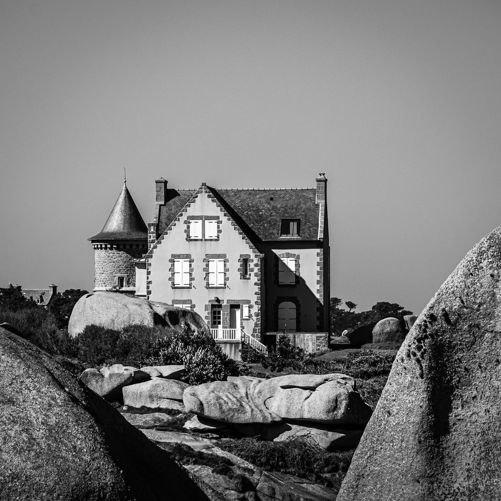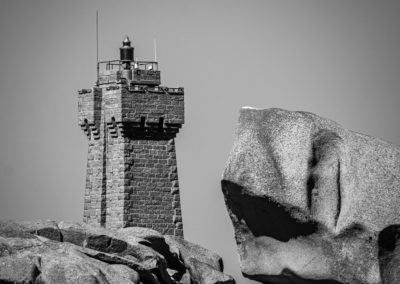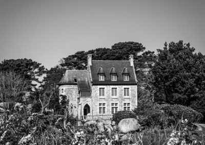 Cette exposition de six photographies en noir et blanc au format carré explore le dialogue silencieux entre l’architecture humaine et le paysage breton. Privées de leur célèbre teinte rosée, les formations granitiques révèlent leur puissance brute, leur caractère sculpté par les millénaires. Les phares se dressent comme des sentinelles éternelles, leurs silhouettes géométriques contrastant avec le chaos organique des rochers. Les demeures aux pierres ancestrales, semblent naître du granite lui-même, prolongement naturel de la roche-mère.
