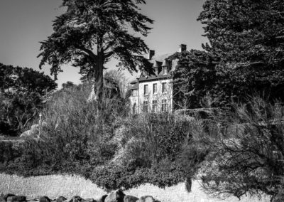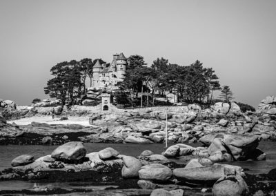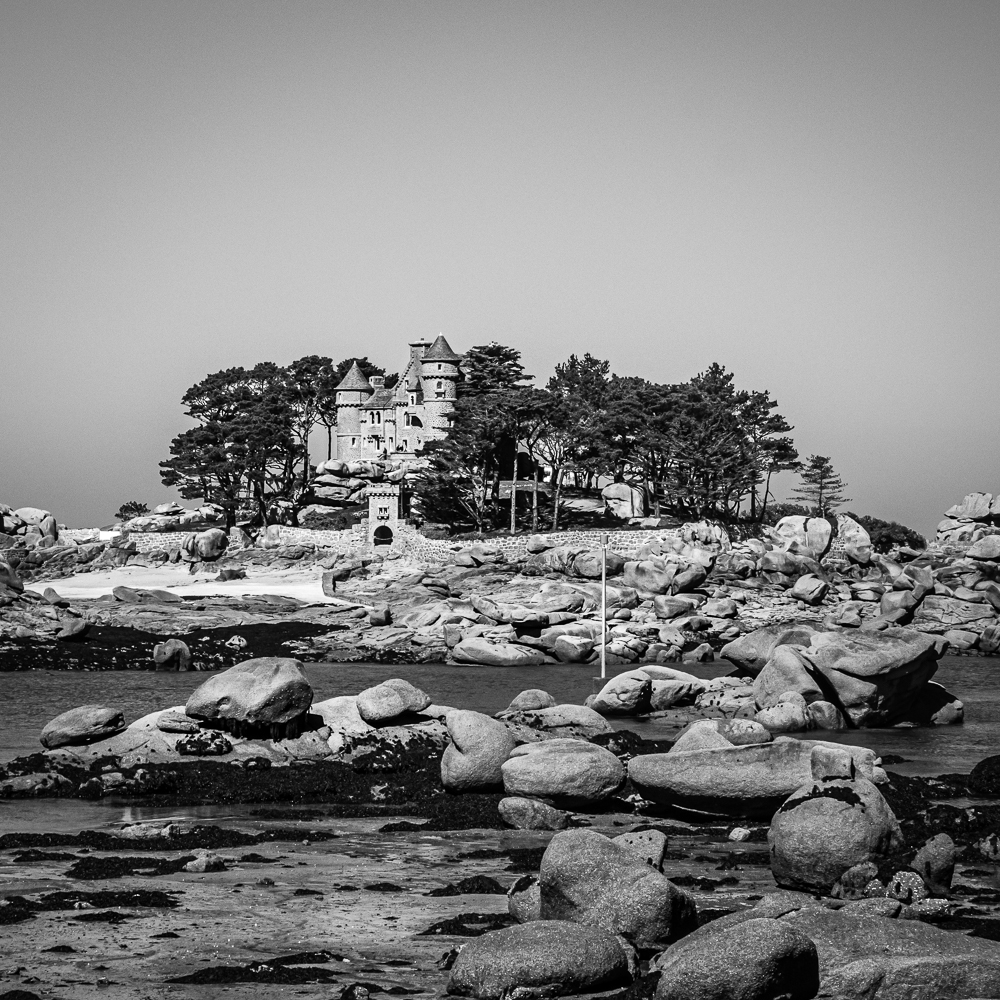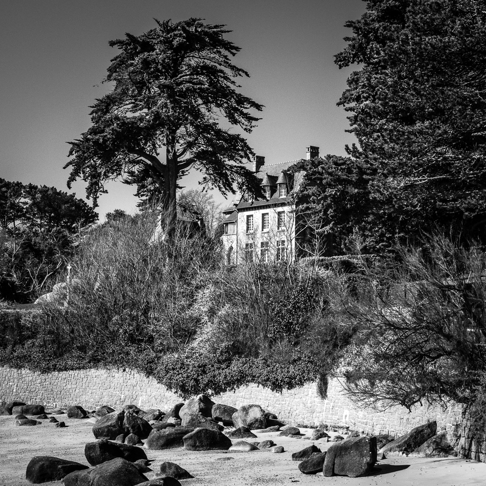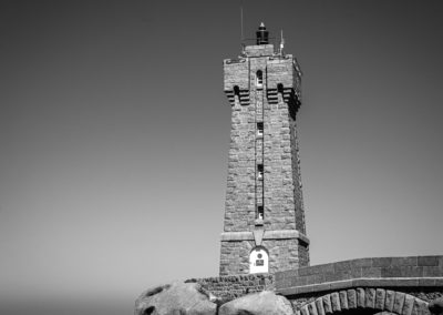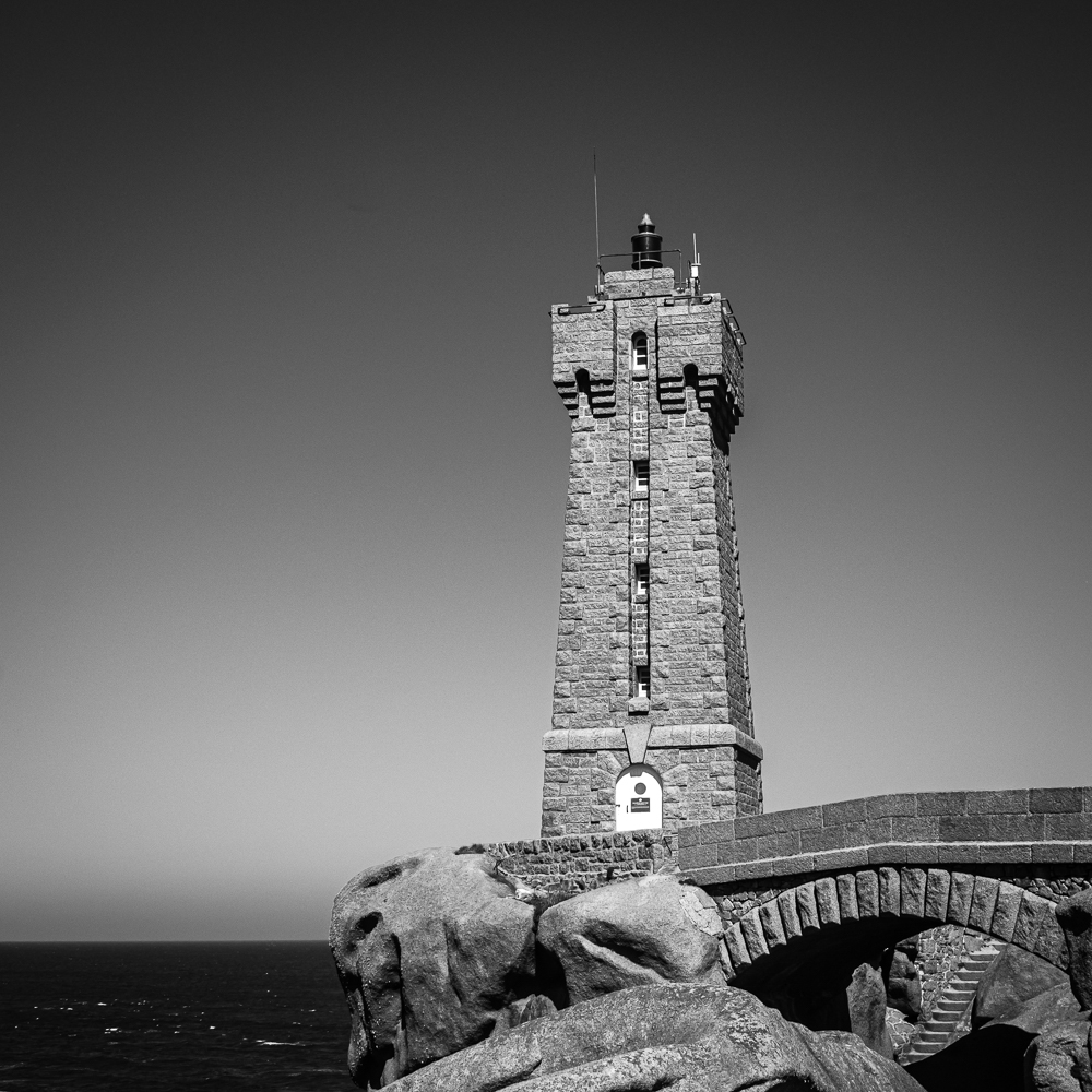 Cette exposition de six photographies en noir et blanc au format carré explore le dialogue silencieux entre l’architecture humaine et le paysage breton. Privées de leur célèbre teinte rosée, les formations granitiques révèlent leur puissance brute, leur caractère sculpté par les millénaires. Les phares se dressent comme des sentinelles éternelles, leurs silhouettes géométriques contrastant avec le chaos organique des rochers. Les demeures aux pierres ancestrales, semblent naître du granite lui-même, prolongement naturel de la roche-mère.
